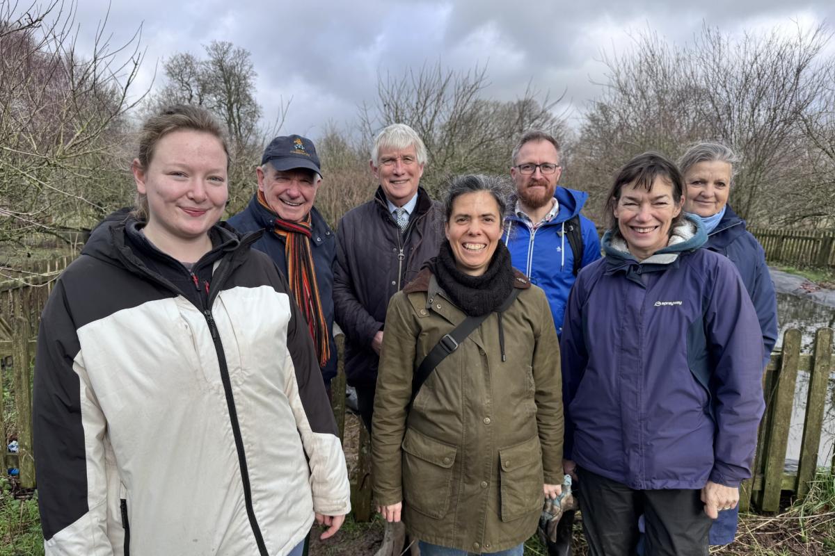 Председатель Dorset Community Foundation, Том Флуд CBE, второй слева, вместе со своим персоналом и членами совета директоров во время визита в Transition Town Dorchester в Пондберри. (Изображение: Dorset Community Foundation)